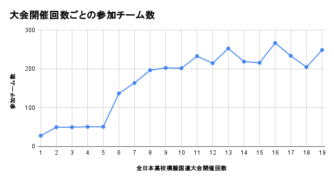 全日本高校模擬国連大会への応募チーム数は下記の図(※)の通り推移しております。予選会を通過するのは、このうち約80チーム(160名)です。