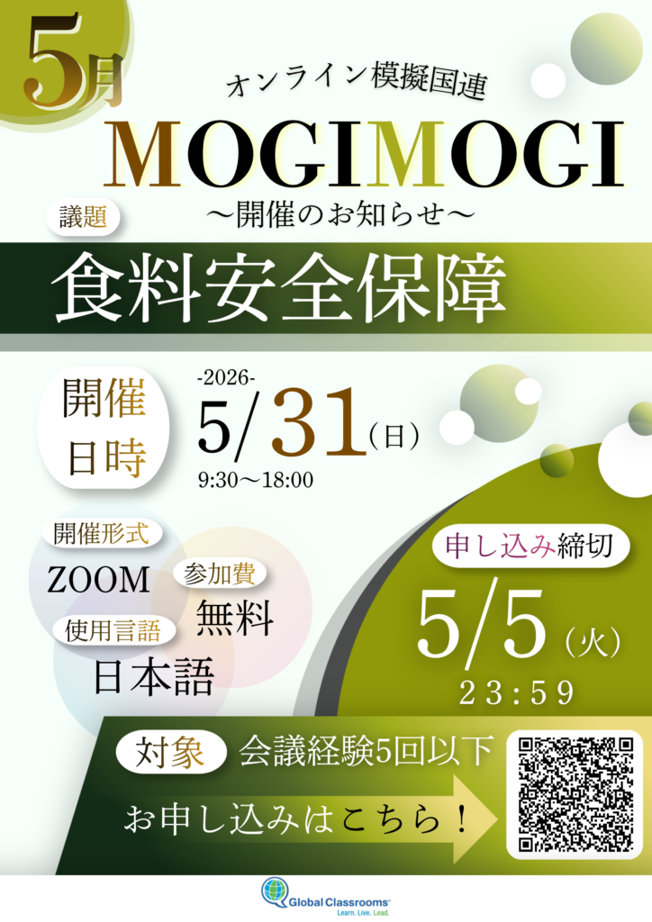中高生向け模擬国連学習企画「オンライン初心者MOGIMOGI」を開催いたします。今回は初心者会議であるため、模擬国連会議への参加経験が5回以下の方が参加対象となっております。多くの方のご参加をお待ちしております。