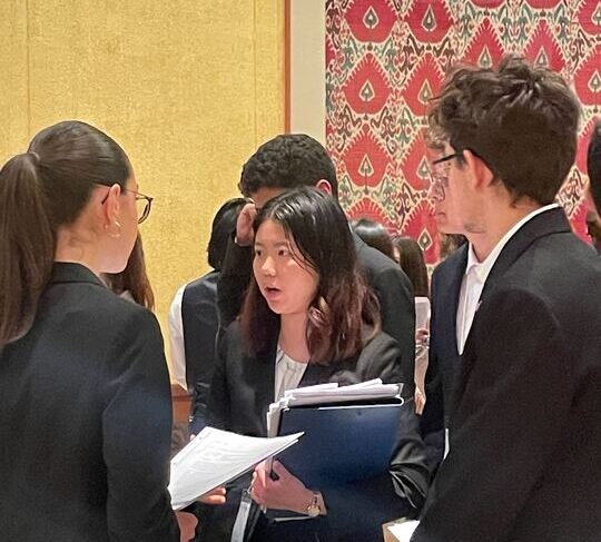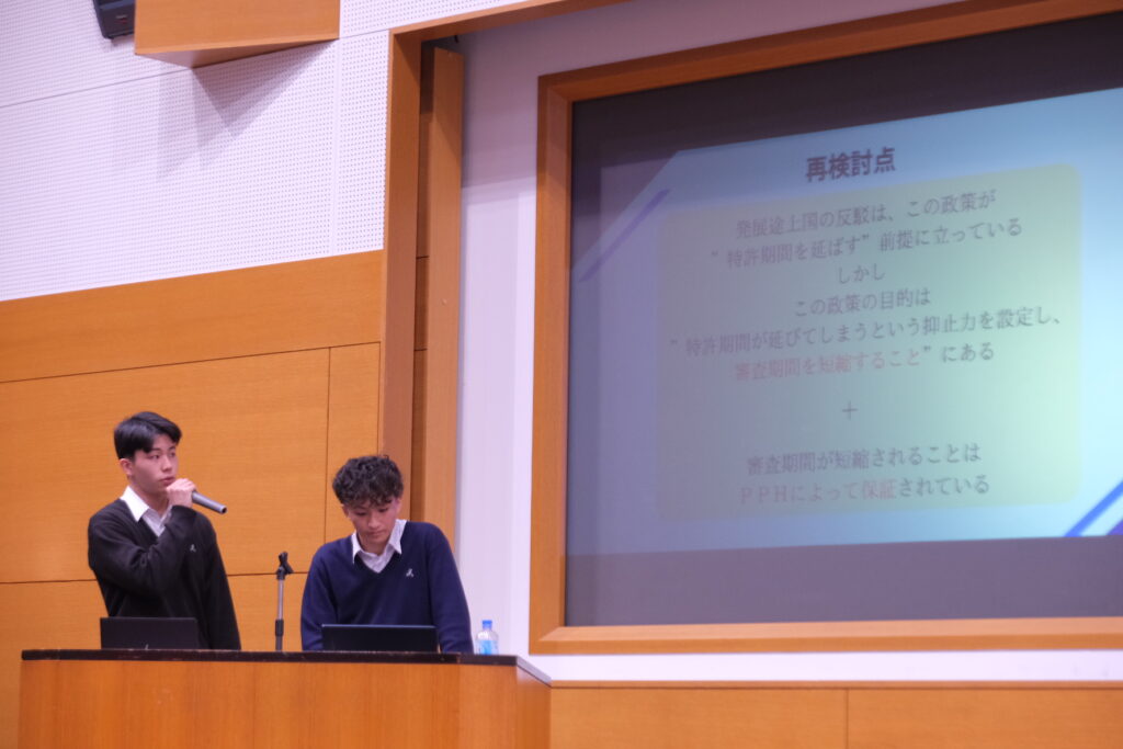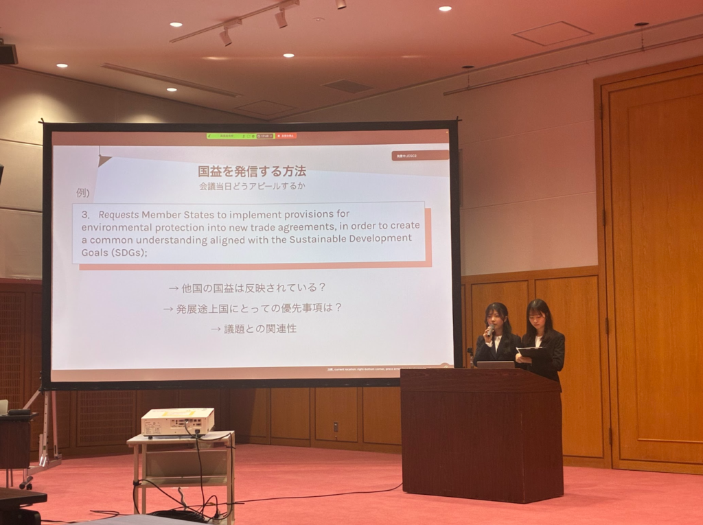 国際大会派遣に先立ち、3月下旬に開催する政策発表会では、渡米説明会や表敬訪問、政策の改善などを行います。政策発表のセクションでは、各派遣生が大使の立場で自分たちの立てた政策を英語で発表します。発表後は、外務省職員など専門家の方々や派遣OBOGから質問・フィードバックをいただいており、議題や担当国について理解を深める良い機会となっています。政策発表会の後にはグループディスカッション形式の企画を行い、実践形式で英語を用いるとともに、派遣生同士が仲を深められ、今までに派遣されたOBOGの経験談を聞くこともできるなど、有意義な時間を過ごします。